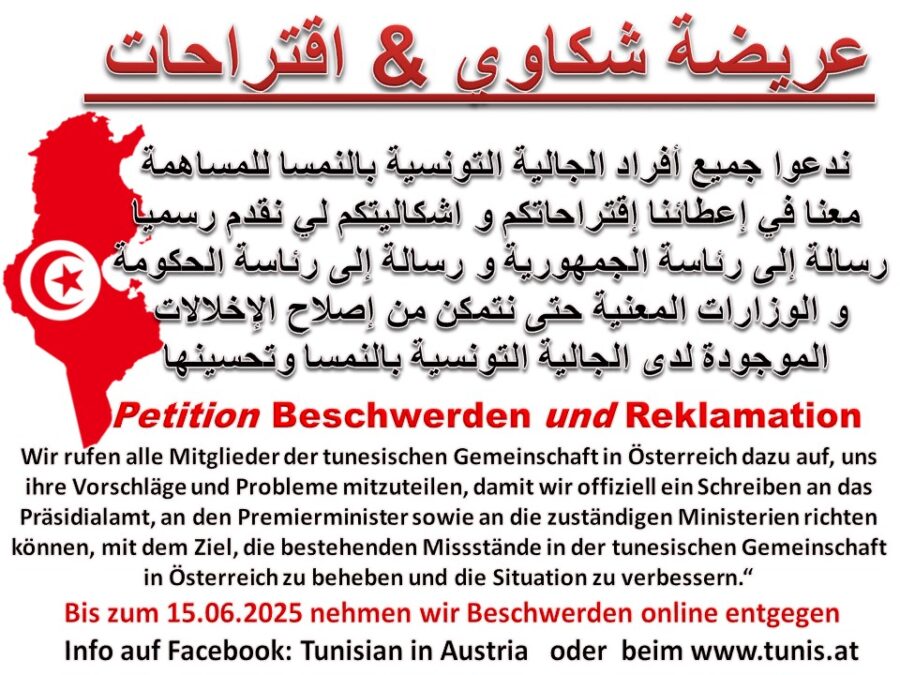 Wir rufen alle Mitglieder der tunesischen Gemeinschaft in Österreich dazu auf, uns ihre Vorschläge und Probleme mitzuteilen, damit wir offiziell ein Schreiben an das Präsidialamt, an den Premierminister sowie an die zuständigen Ministerien richten können, mit dem Ziel, die bestehenden Missstände in der tunesischen Gemeinschaft in Österreich zu beheben und die Situation zu verbessern.“